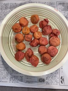 デイサービスの裏に畑があり、いつもたくさんのお野菜や果物を頂いているのですが、梅の実を頂いたので見様見真似で作ってみました✨